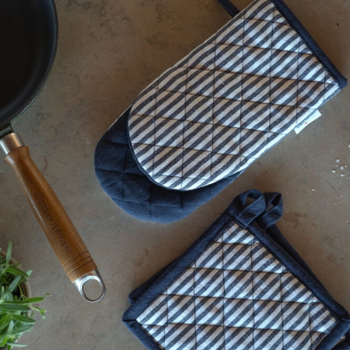Gryteklut med blå striper på hvit bakgrunn med marine detaljer, laget av bomull og lin.