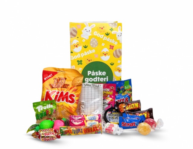 Stratos 10g, Twix 10g, Lion Bite 18g, Fruktlollipop 12g, Frisia Mini Kabel 7g, Mini Love Hearts 10g, Brusepulver frukt 10g, Gott & blandat 50g, Trolli pose 25 g, Popping Candy 12g, Hockey Pulver 12g, Sure fruktbollar 34g, Kims 30g salt,Påskeyatzy.