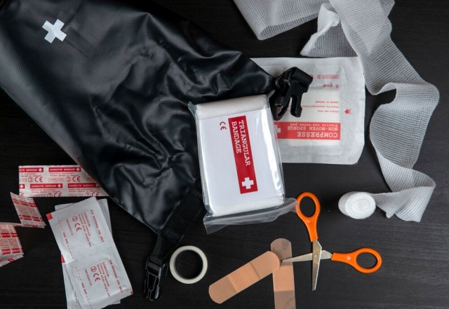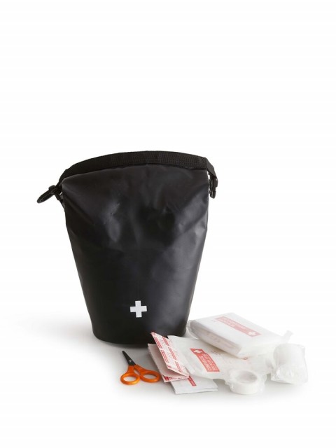 Liten og praktisk vanntett veske med førstehjelpsutstyr. Topplokket rulles opp og settet blir lite og enkelt å ta med seg på båten, i skogen, på reisen osv. Settet inneholder: Saks Gasbind Plaster Sårvask Kompress Fatle Sårteip