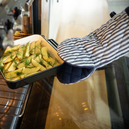 Den polstrede votten beskytter hånden mot varme ved matlaging eller baking og henges enkelt opp i den påsydde løkken.