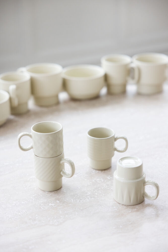En 4-pakning stabelbare espressokopper i steintøy med en karakteristisk lettelse i en vakker naturinspirert farge.