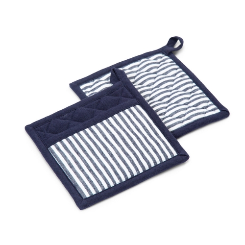 Gryteklut med blå striper på hvit bakgrunn med marine detaljer, laget av bomull og lin.