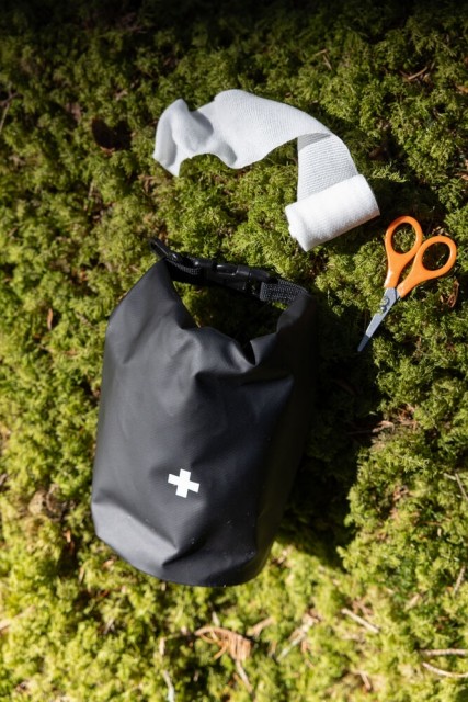 Liten og praktisk vanntett veske med førstehjelpsutstyr. Topplokket rulles opp og settet blir lite og enkelt å ta med seg på båten, i skogen, på reisen osv.