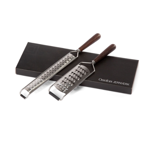 2-pk. rivjern fra Orrefors Jernverk pakket i svart gaveeske. Det lange rivjernet passer godt til å rive f.eks. oster og sitrusfrukter i fine flak. Det brede gourmetrivjernet egner seg godt i matlaging for å rive større flak. Begge rivjern har håndtak i brunt wengetre. Toppen har en gummilist som kan lenes mot underlaget slik at rivingen blir tryggere. Størrelse: 30,5 & 38,5 cm Emballasje: OJ Gaveeske Orrefors Jernverk kjennetegnes av robuste kjøkkenprodukter som kombinerer kvalitet, funksjon og stilig design.